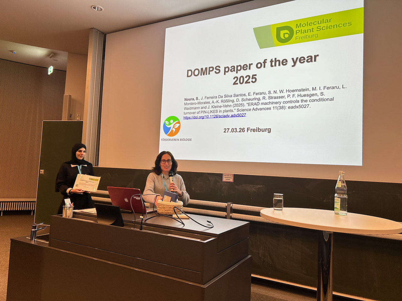Der krönende Abschluss des diesjährigen DOMPS Symposiums war die Verkündung des Preises für die interessanteste wissenschaftliche Publikation aus den molekularen Pflanzenwissenschaften. Eine Jury aus NachwuchswissenschaftlerInnen kürte die Doktorandin Frau Seinab Noura (AG Kleine-Vehn) zur Siegerin. Der durch den Verein gesponserte Preis wurde von Frau Prof. Laura Ragni übergeben. Herzlichen Glückwunsch!